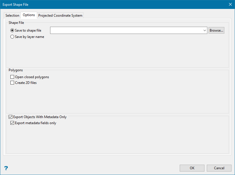 Specify the name of the Esri Shape file (.shp) you want to use to store the exported data. The drop-down will list all (.shp) files in the current working directory. Click Browse to select a file from another location. To create a new file, enter the file name and file extension.