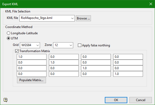 Use this option to export Vulcan objects (points, lines). Attributes exported: X, Y, Z. Coordinates are assumed as UTM, and are converted to Latitude and Longitude values. If the datum specified for the input objects is WGS-84, the conversion ends. If not, the coordinates are transformed using the Abridged Molodensky Coordinate Transformation Formulae to WGS-84. Current working Datums are (WGS-84), PSAD-56, SAD-69.
