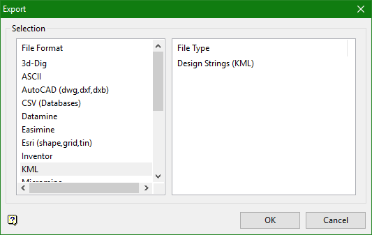 Click KML in the File Format column on the left, then select Design Strings (KML) from the File Type field on the right side of the panel.
