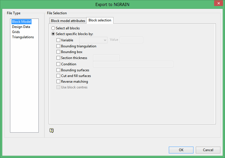 Select this checkbox if you want to restrict the blocks by a single bounding surface. Select the Project down Z-axis checkbox if you want to project down the Z-axis, that is select the blocks that fall below the nominated surface. If this checkbox is not selected, then all blocks that fall above the nominated surface will be selected instead.