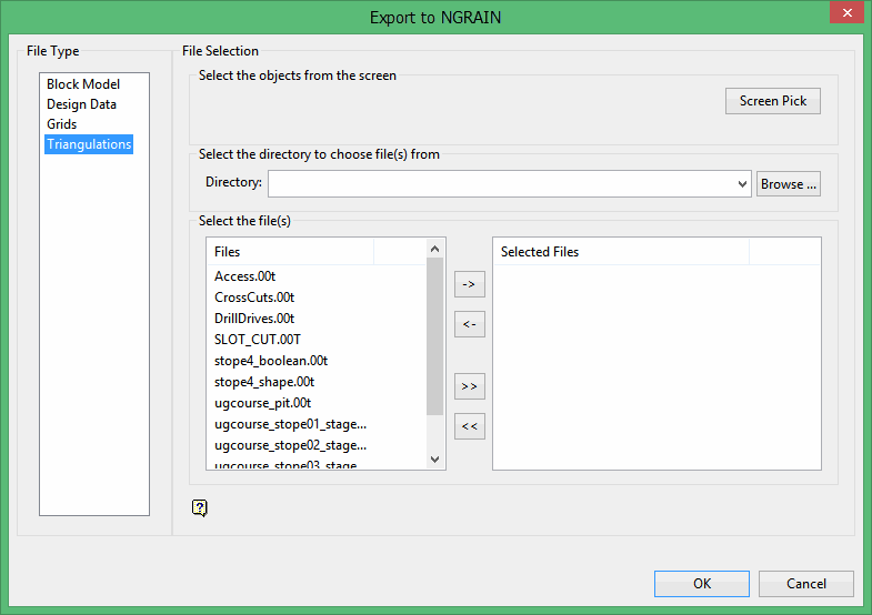 Screen Pick - Select triangulation(s) that are already displayed on the screen. Click on the triangulation(s) you want to export and then right-click to return to the panel. The triangulations you selected are listed in the Selected Files column in the Select the file(s) section.