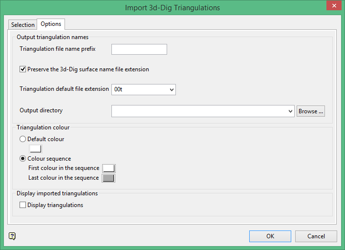 Select from two options. One option is that all triangulations will be the same colour. The other option is that the triangulations will be assigned a colour based on the colour palette settings. Select the first and last colour in the sequence and the imported triangulations will cycle through the colours in between until all triangulations have been imported.