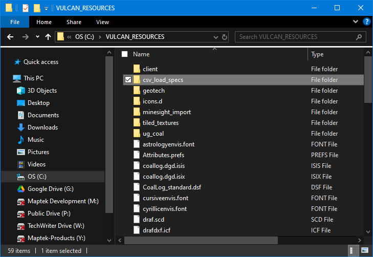 .csvimport specification file is located in the Vulcan Resources area which can vary depending on environment variable setup. In the resources folder, there is sub-folder calledcsv_load_specs. This folder contains the fileimport.csv.spec. You can view the contents of this file in a text editor. Although the specification file can be edited in a text editor, to delete a specification it is recommended to use the Delete button in the Import CSV panel.TipTo quickly locate the sub-folder