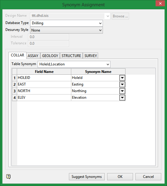 Use this panel to assign the header names in CSV files to field names in the drilling database. Synonyms are used to link design fields to external fields when the names of the fields are different as may be the case when compiling data from different sources.