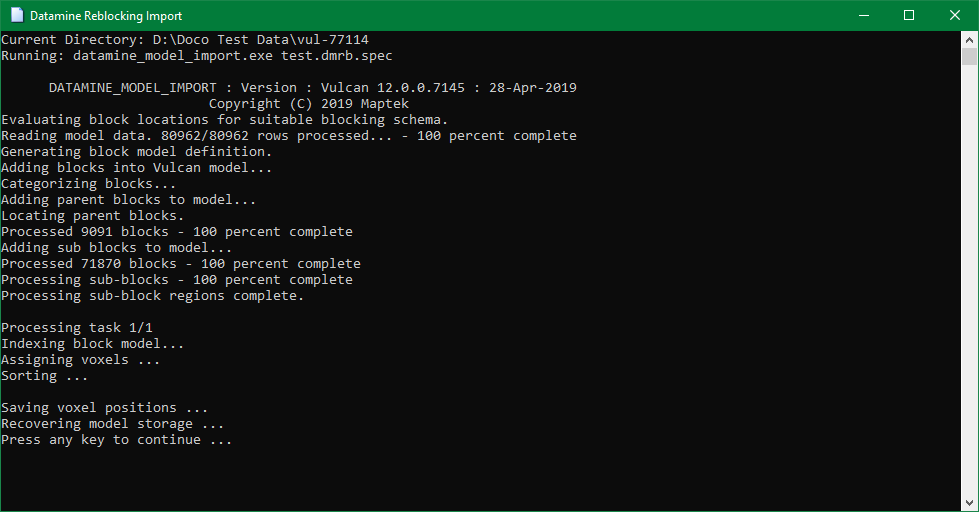 A command line prompt displays the import progress. Once the data has been imported, you can see a report of the total number of blocks in the Datamine block model, the number of blocks and sub blocks imported into the Vulcan block model, and other processes involved in the import.