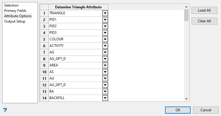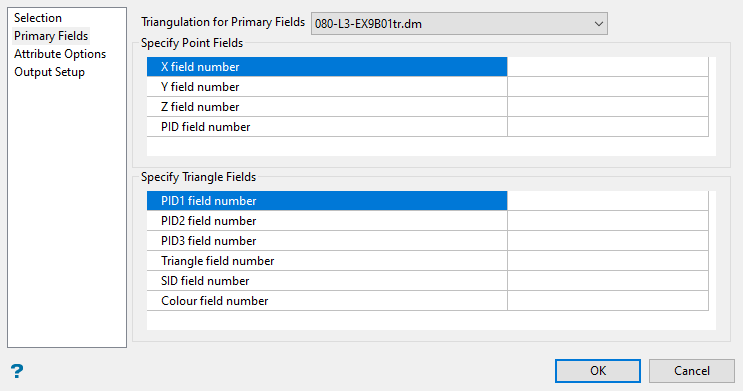 This section lists all of the fields found in Datamine triangles file. Use this section to determine the field numbers for the (PID1...PID3, Triangle, SID and Colour) on the information in the Datamine file header.