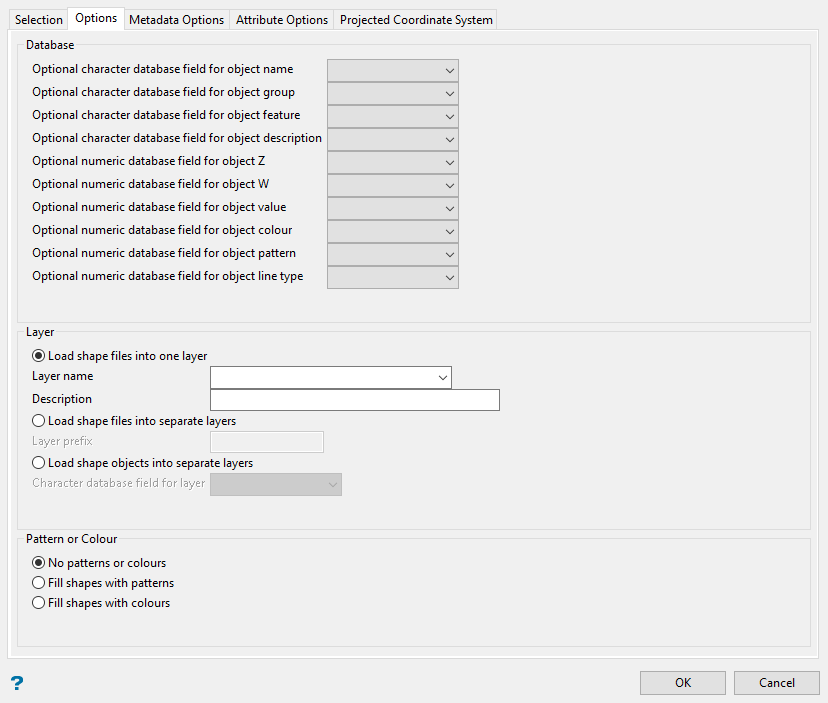 Use these fields if you have information in the database (shape files) that you want to enter in the object name, group, feature, description, Z and W values. Enter, or select, the character or numeric, database fields for object name (character), group (character), feature (character), description (character), object Z (numeric), object W (numeric), value (numeric), colour (numeric), pattern (numeric) and line type (numeric).