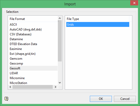 Click OK to display the Geosoft Grid file Import Selection panel.