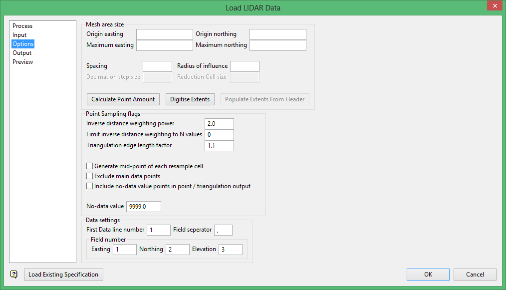 This option is used to determine the area in which the new data set resides. Provide the origin and maximum values of easting and northing.