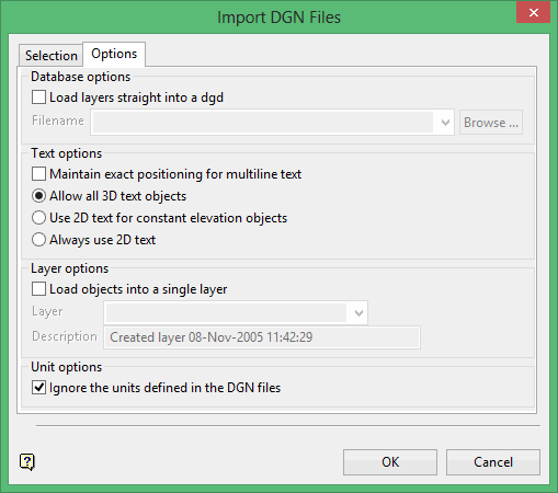Select this check box to load the contents of the selected files into a nominated design database. The drop-down contains the names of all design databases (.dgd.isis) found in your current working directory. Click Browse to select a file from another location. If this check box is not selected, then the data will be imported into the currently open design database.