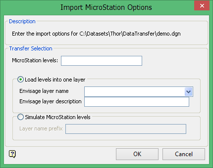 Enter the levels in the MicroStation file that you want to transfer to Vulcan layers. The maximum number of levels that a MicroStation file can have is 63. Individual levels can be specified by separating them with a ',' (comma) while ranges can be specified by a '-' (dash).