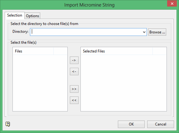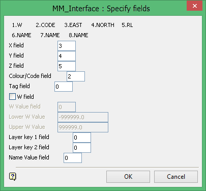 The chosen file will be used to populate the Specify Fields panel. The top section of this panel contains all of the fields and field numbers stored in the Micromine file. Use this section to complete the remainder of the panel. Vulcan will enter default field numbers based on the Micromine field names.