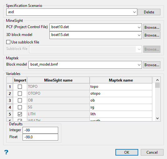 Use the grid to select which variables you want to import into the Vulcan block model. You can rename a variable by replacing the name in the Maptek name column.