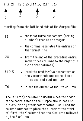 The first of the three real numbers represents the location of the Y coordinates, the second represents the location of the X coordinates, and the last represents the location of the Z coordinates. The Fortran format statement, which must be enclosed in brackets, can contain up to forty alphanumeric characters.