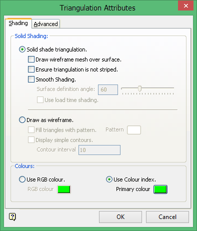 The Triangulation Attributes panel will allow you to specify display parameters, such as colour and shading, for the triangulation. Refer to Model > Triangle Utility > Attributes for more information on this panel.