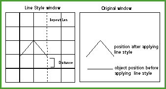 The distance between the X axis and the pattern is the distance between the centre line of the object to be "painted" and the pattern. The centre line is the line that would be defined by the digitised points if no line style was painted on it.