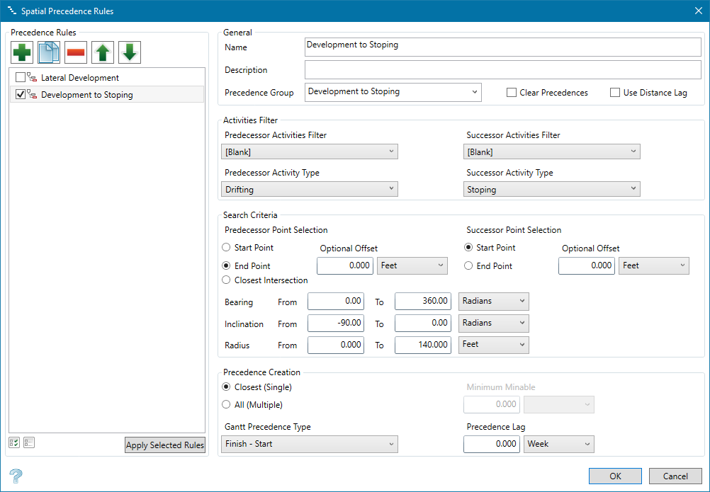 On the Precedences tab, in the Vulcan Spatial group, click Spatial Precedences to display the Spatial Precedence Rules panel.
