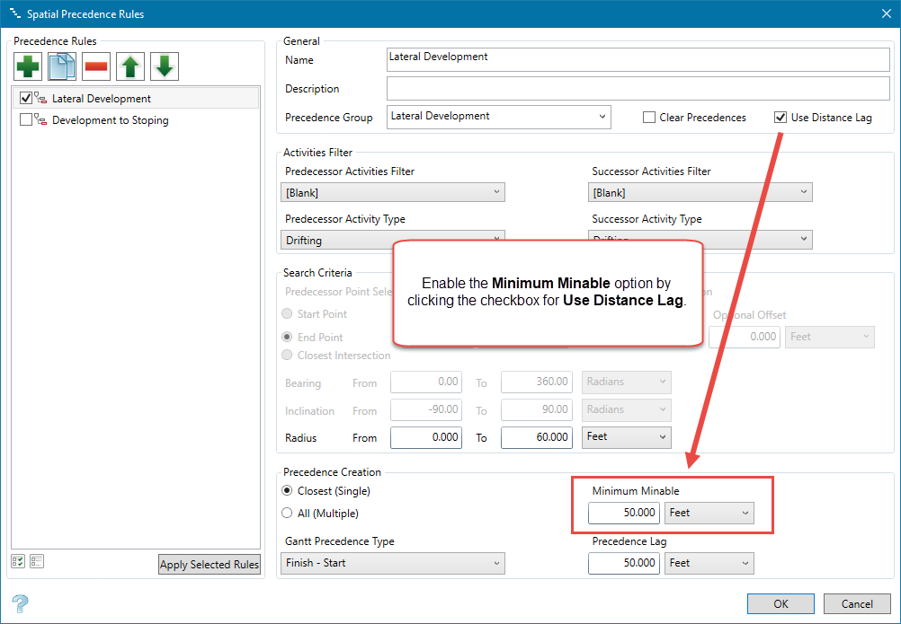 If there is a lag between the predecessor and successor, enter a threshold for the minimum mining distance and select the unit of measurement.