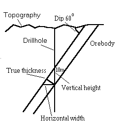 Given a 10 m long composite from a vertical drillhole and an orebody dip of 60 degrees and direction of 135 degrees, the true thickness will be 5 m, the horizontal width will be 5.77 m and the vertical height will be 10 m.