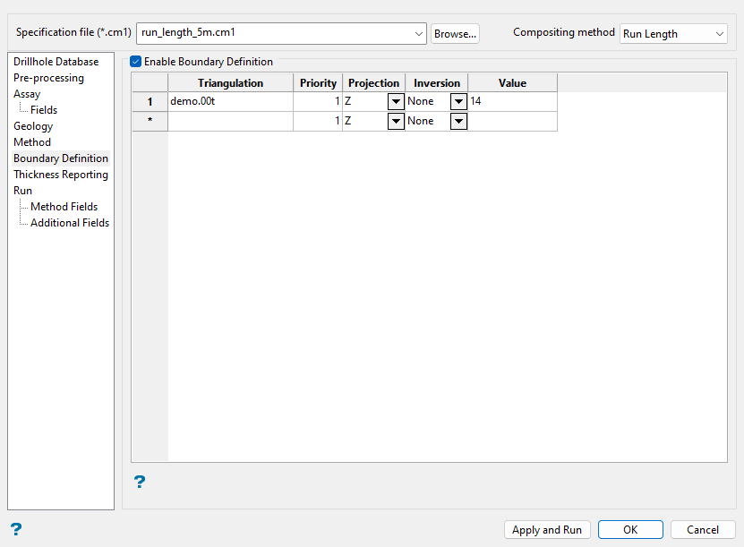 Note:  Defining boundary definitions will override the parameters set in the Method pane in order to break the composite at the boundary of the selected triangulations. This may result in small composites, but may help ensure samples identify with a given domain when estimating the block model.