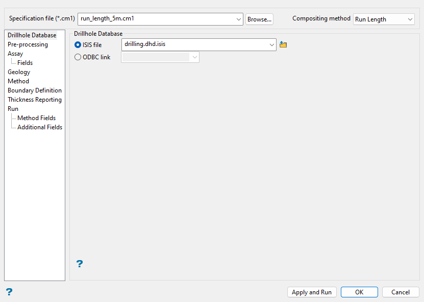 3. Select the Drillhole Database to be used for compositing from the Isis file or ODBC link drop-down lists. To select an Isis file from a location other than the current working directory, click to browse to another location.