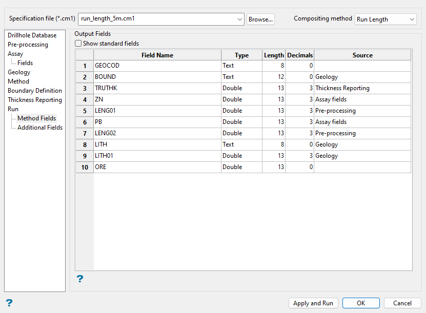 Parameters set in the Method pane are respected, but Boundary Definition parameters (if present) may still result in small composites. The majority code in the composite interval writes to a field in the composite file named after the majority field (e.g. LITH). The percentage of the composite length that consists of the majority code is also written to the composite file in an associated field named after the majority field with a two-number suffix at the end (e.g. LITH01), numbered per the majority field sequence in the grid at the bottom of the panel.