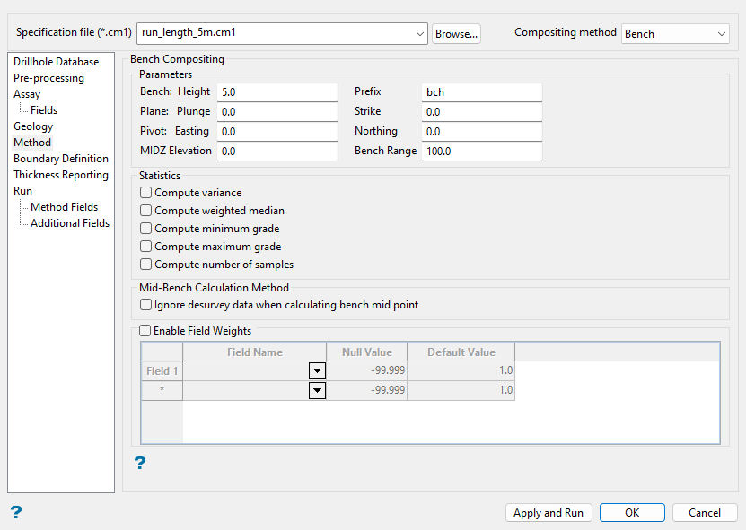 The total length of all samples is recorded, as well as the total length and average grade of the samples used. Here, 1 m samples will be composited over a 5 m bench. The default exclusion range is used: >= -99999.000 and < 0.000.