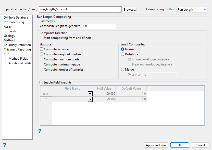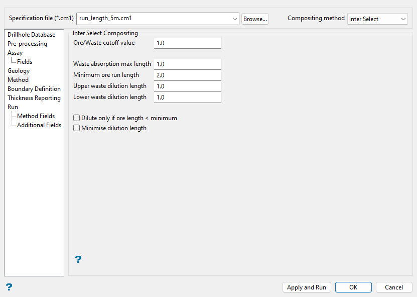When the Compositing option is launched, start by populating the fields at the top of the panel to define the compositing specification file (.cm1) and compositing method, then go to the Drillhole Database section to select the database for compositing.