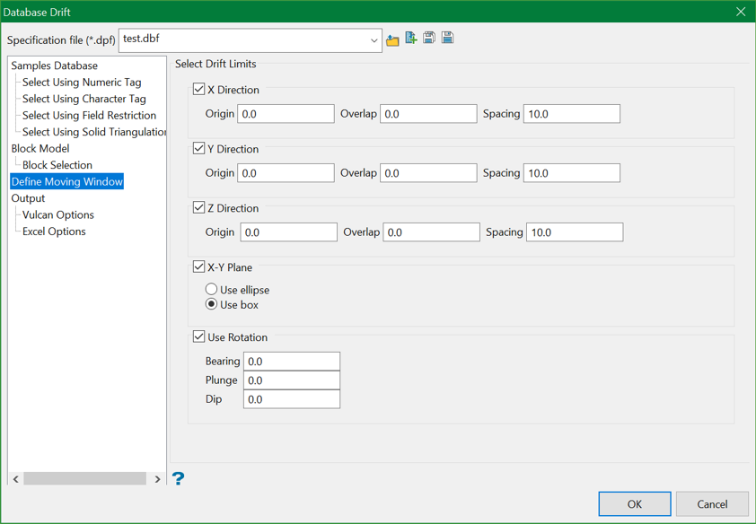 Select this checkbox to perform analysis in an orientation different from the Cartesian coordinates. For Bearing, Plunge and Dip, enter the orientation of the data. If you do not know the orientation of a block model, go to Block > Header to get the rotation values.