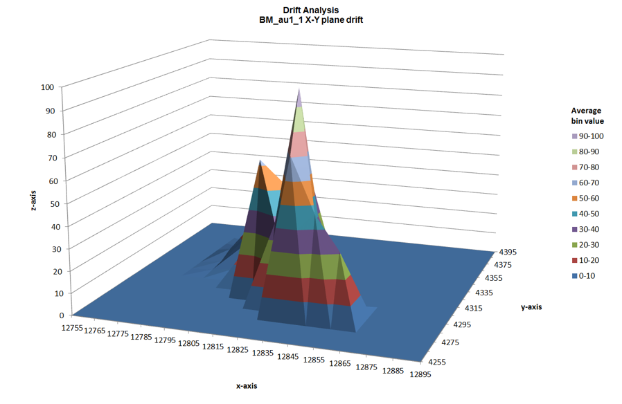 Select this checkbox to calculate the x slice by the y slice averages. Select this checkbox to calculate the x slice by the y slice averages. If the Excel output option is selected, a 3-D drift analysis chart will appear in the output, indicating the mean grade of the analysed material in terms of its X, Y, and X coordinates. An example is shown below.