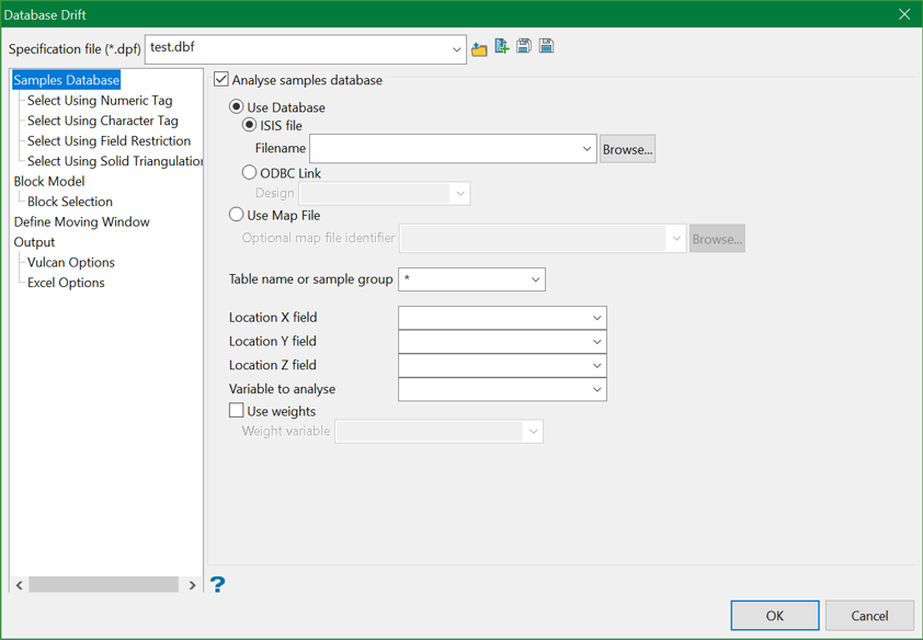 Select the Database Drift specification file (.dpf) that you want to open. The drop-down list contains all .dpf files found in your current working directory. Click Browse to select a file from another location.