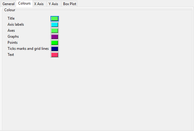 Select the colours for the graph elements (graph title, axes labels, graph points, grid lines etc). The colours are selected from the current colour table.
