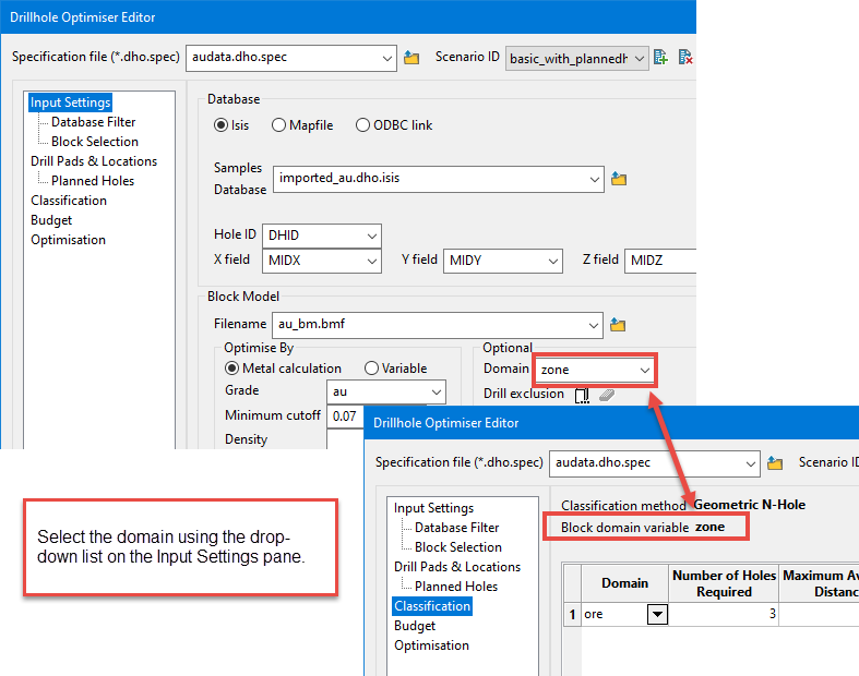 If any of the output classification variables match the optional input variables, then the headers will turn red to indicate there is a conflict. If Apply and Run is pressed the program will not complete the optimisation and comments in the Drillhole Optimiser Window will indicate which variables conflict.