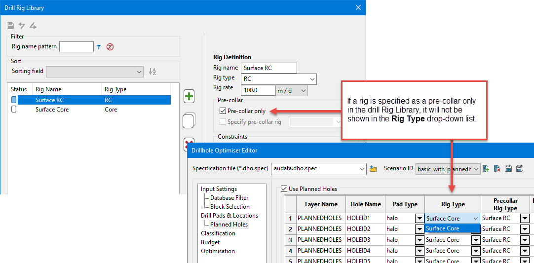 Before starting the Drillhole Optimiser Editor, make sure you have already created a library of available drill rigs and their parameters using the Drill Rigs Library.