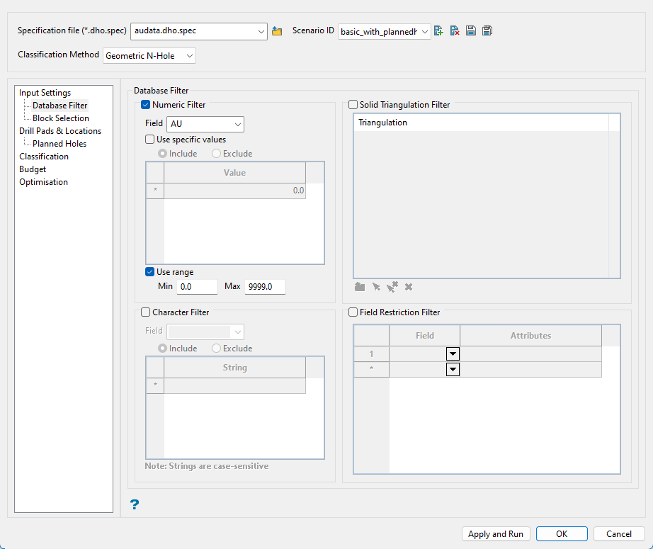 Set up any options to limit where DHO will allow drillholes to be considered by using the filters in the Optional section. These are all optional and not required. The options include: