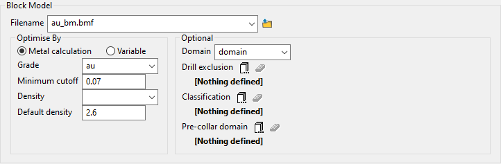 If you choose to optimise by Metal calculation, select the variable containing the grade obtained from the block model from the Grade drop-down list. Then enter a Minimum cutoff value in the space provided. The optimiser will target model blocks at or above this cutoff. Also select the block model variable used for Density. If a density variable is not specified, the value considered will be the default density. If the default value for density if it is not defined by a variable, then you will need to enter a value in the space labelled Default density.