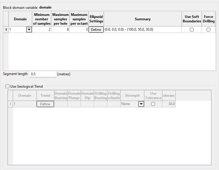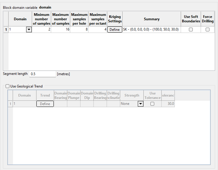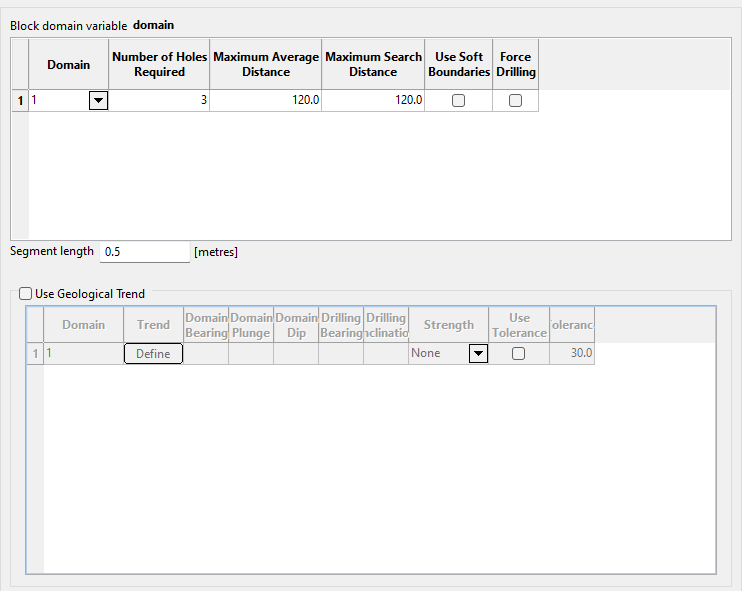 It may be helpful to enable Force Drilling if you are working with tabular/vein deposits. With this option, the holes that enter a block in the selected domain must have at least one composite that is not in the domain on both sides. This forces a drillhole to punch through a domain rather than stopping part way through.