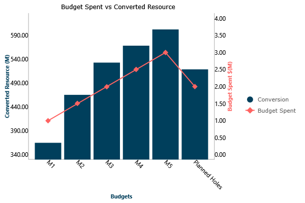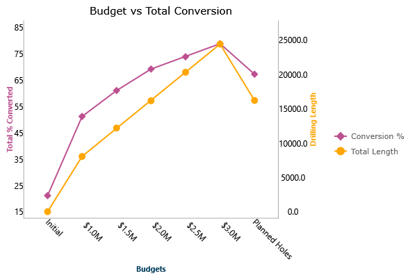 Figure 5: Total % conversion and footage, which displays the percent of conversion for each budget, plus the drilling length for each one. The percent conversion is based on the total number of blocks available based on the constraints applied.