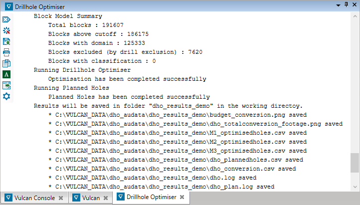 The optimiser also provides users with several CSV files as an output. These files are displayed in the Drillhole Optimiser window, indicating the output folder and the path for each file, as shown below. The window also provides a block model summary indicating how many blocks are used in the optimisation.