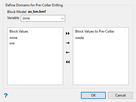This overrides the DHO generated classification with the actual classification in the block model. Use this to specify what categories to make available for targeting. For example, if you want to drill Inferred blocks and avoid drilling Measured and Indicated, then select Inferred by moving it to the box on the right.