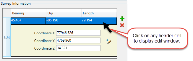 Alternatively, you can highlight the drillhole in the list on the left side of the panel, then click anywhere in the header of the Survey Information table to display the coordinates and edit from there.