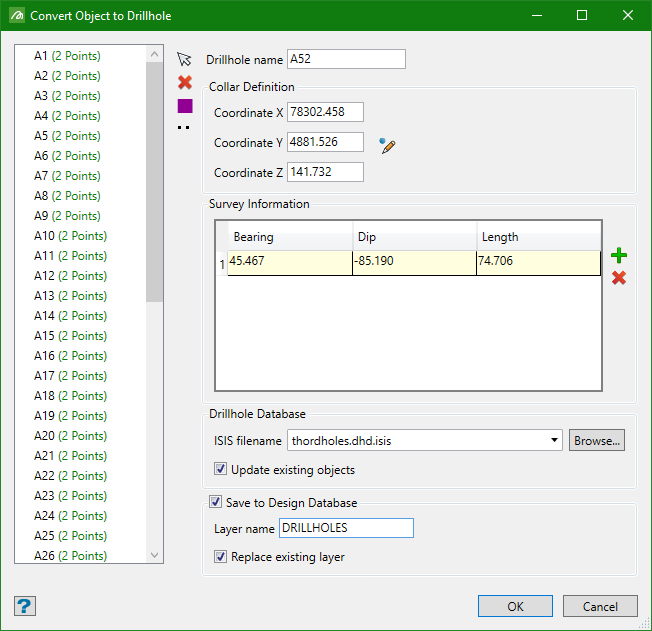 On the Geology menu, point to Drillhole Planning, and then click Convert Object to Drillhole.