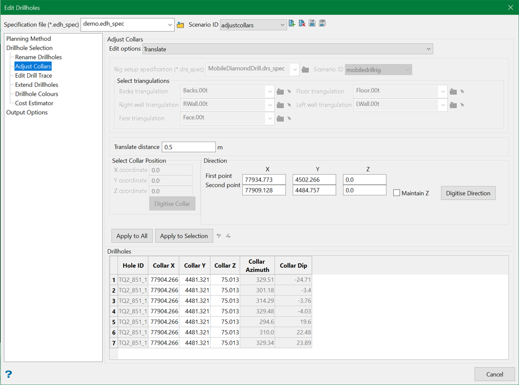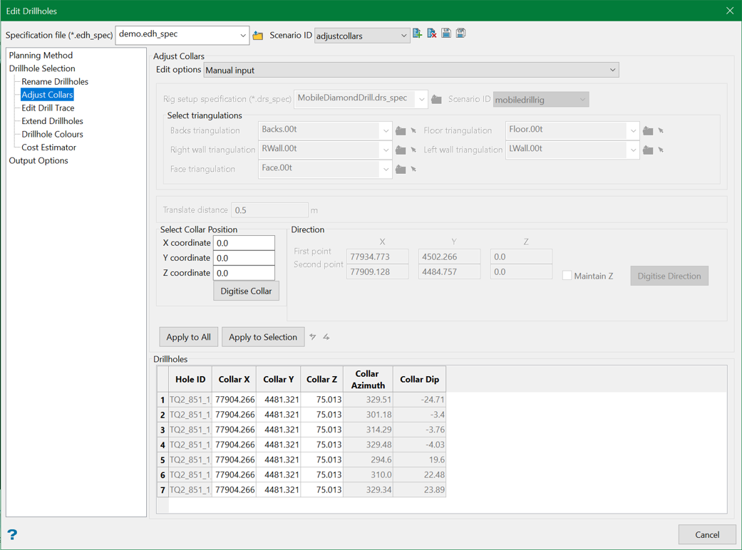 When drillholes have been created from planning design data, such as a drive centreline, the final collar positions of the drillholes may need to be adjusted to account for things like the drill rig setup constraints or other potential hazards.