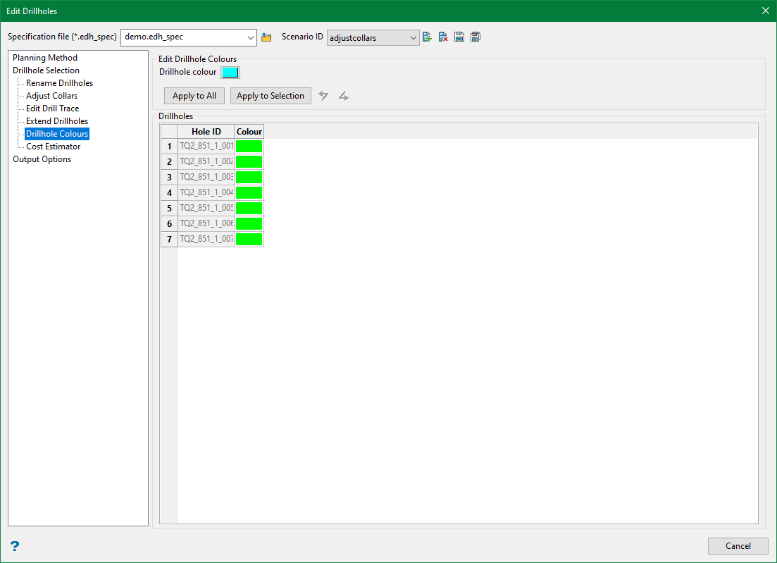 Select the colour of your choice and apply it to all drillholes using the Apply to All button or to those currently selected in the grid by using the Apply to Selection button.