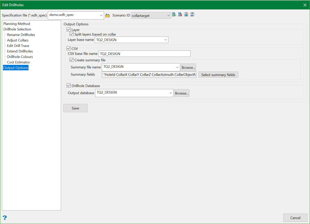 This saves the drillholes as defined by the currently selected output options.