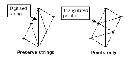This method will not triangulate points across any string data. This option is most likely to be used when edge detail is required. For example, when there is a geological fault in the model.