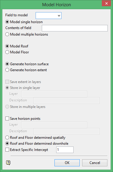 You can either model a single horizon or multiple horizons. If you select to model a single horizon, then you will need to specify the contents of the field, for example rock code. More than one field can be selected when using wildcards. If you select to model multiple horizons, then all data values will be modelled using each horizon’s legend.
