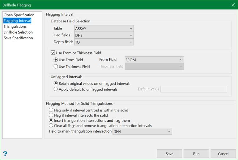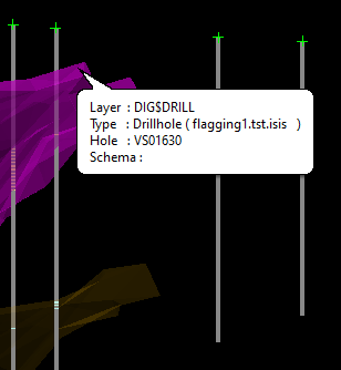 Use the Flag option to insert values into drillhole intercepts according to each intercepts position relative to a set of triangulations. The triangulations and values will be stored in a nominated Drillhole Intercepts Flagging specification file (<proj><name>.dfg).