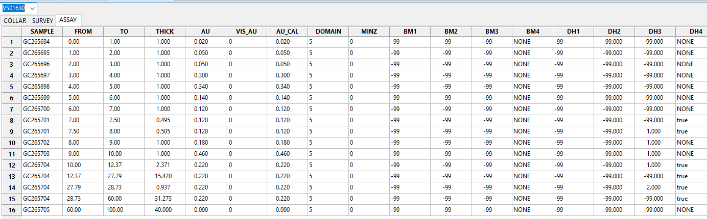 Check out the ASSAY table of the database and you can find extra intervals added to the table flagged with numbers 1 and 2 in the field DH3 and marked “true” in a text field DH4. Note that added synthetic intervals preserve original interval values for the fields other than DH3 and DH4.
