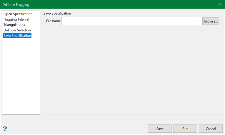 Select the Drillhole Intercepts Flagging specification file (<proj><name>.dfg) that you want to open. The drop-down list contains all .dfg files found in your current working directory. Click Browse to select a file from another location.